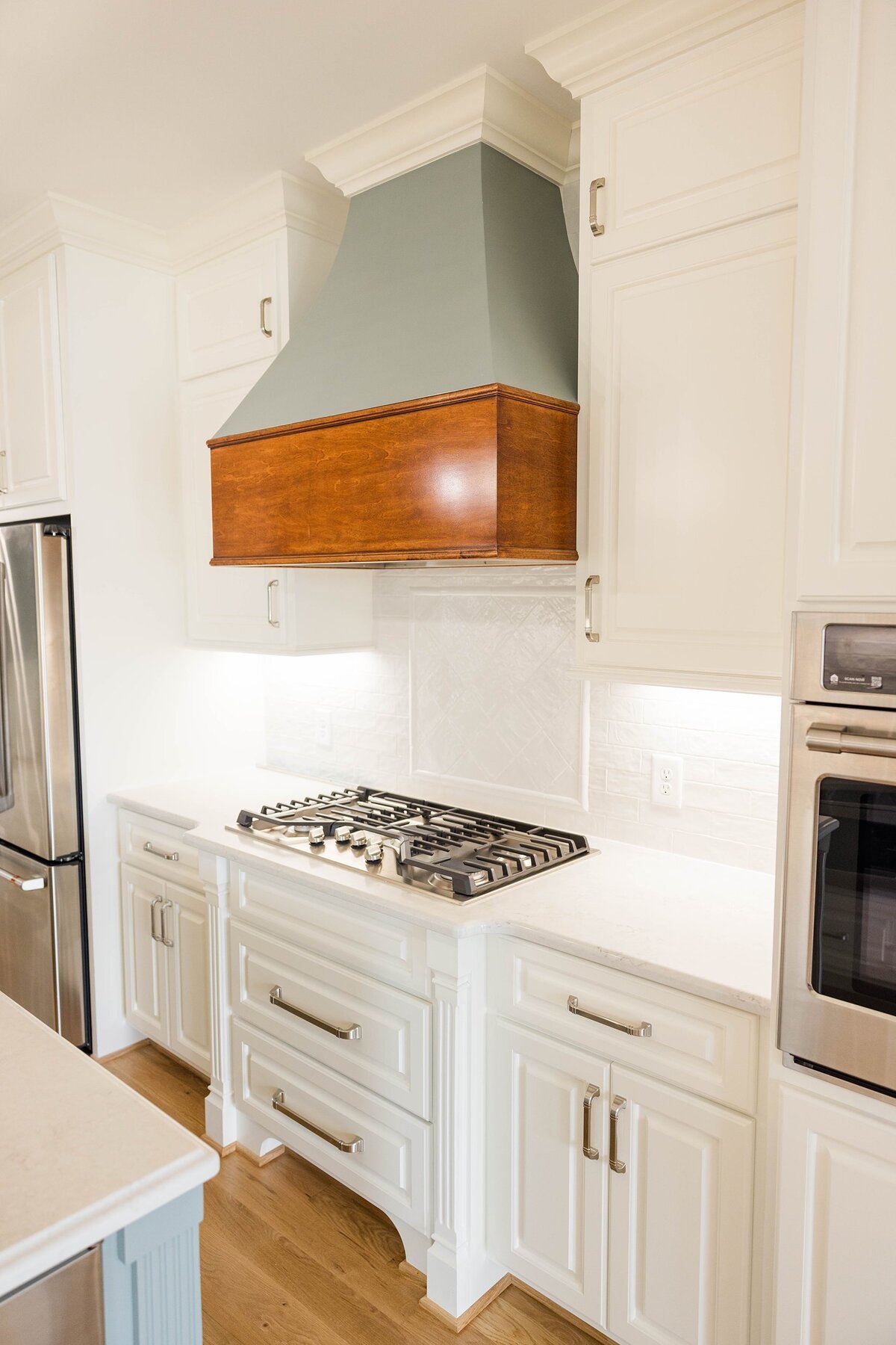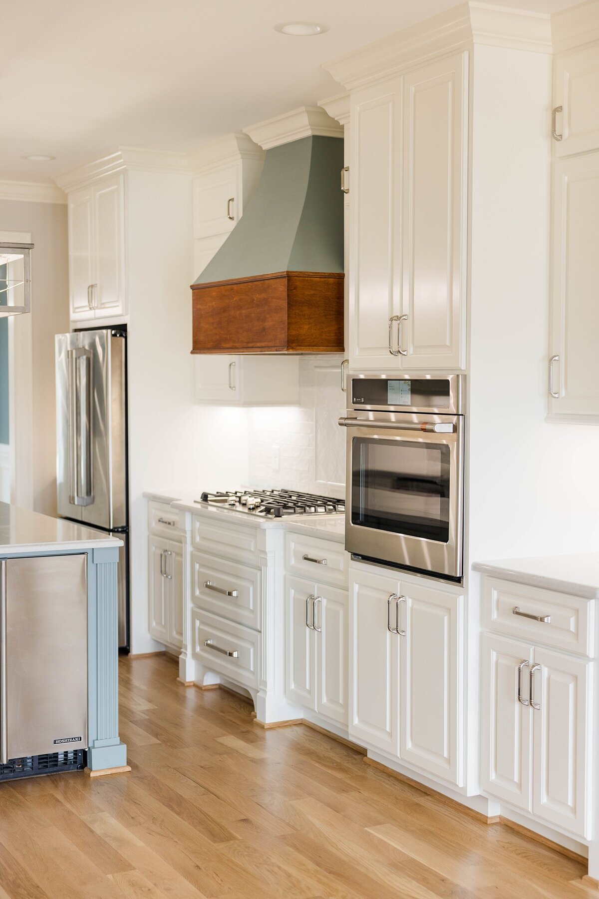 The kitchen had two unique features found in the wood stained oven hood and an ice maker installed directly into the kitchen island. The ice maker was specific to the needs of the Meadows and their hosting which is another benefit of custom-home building—your home can specifically fit your needs.